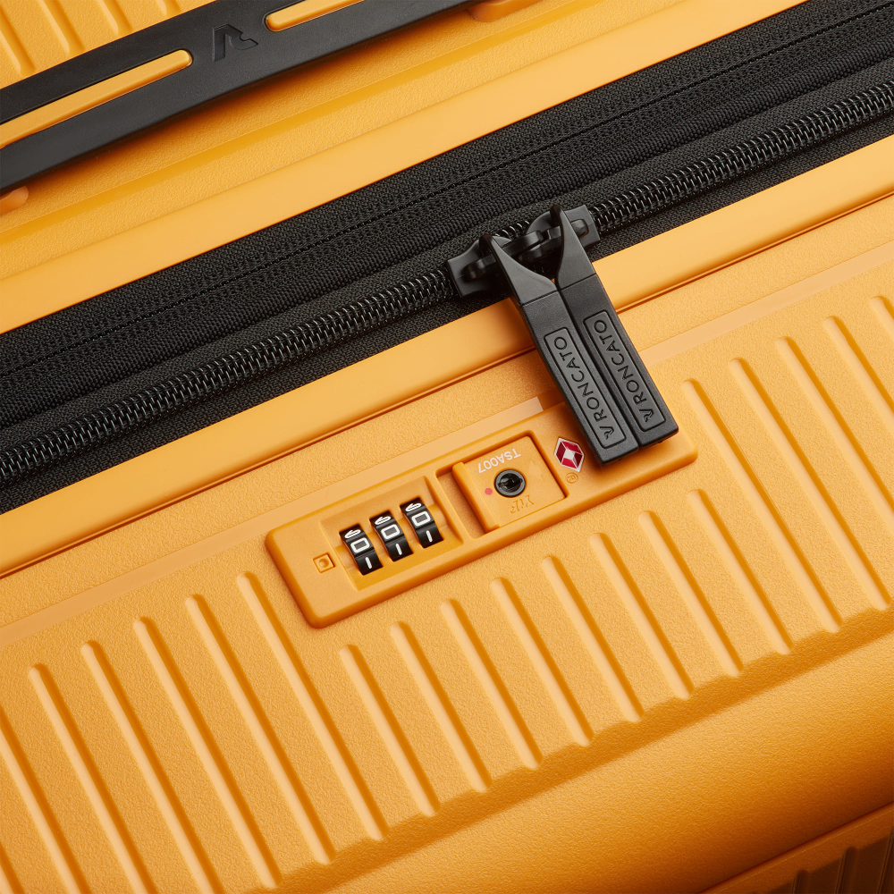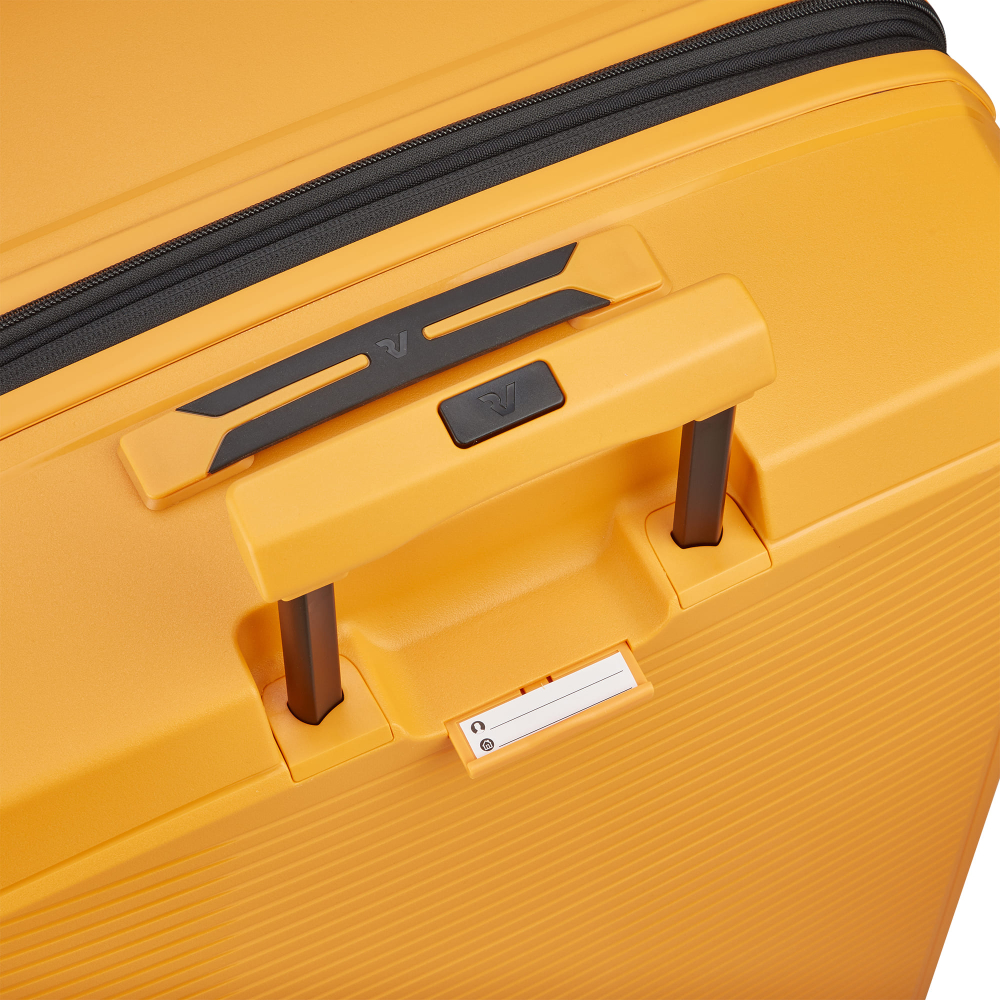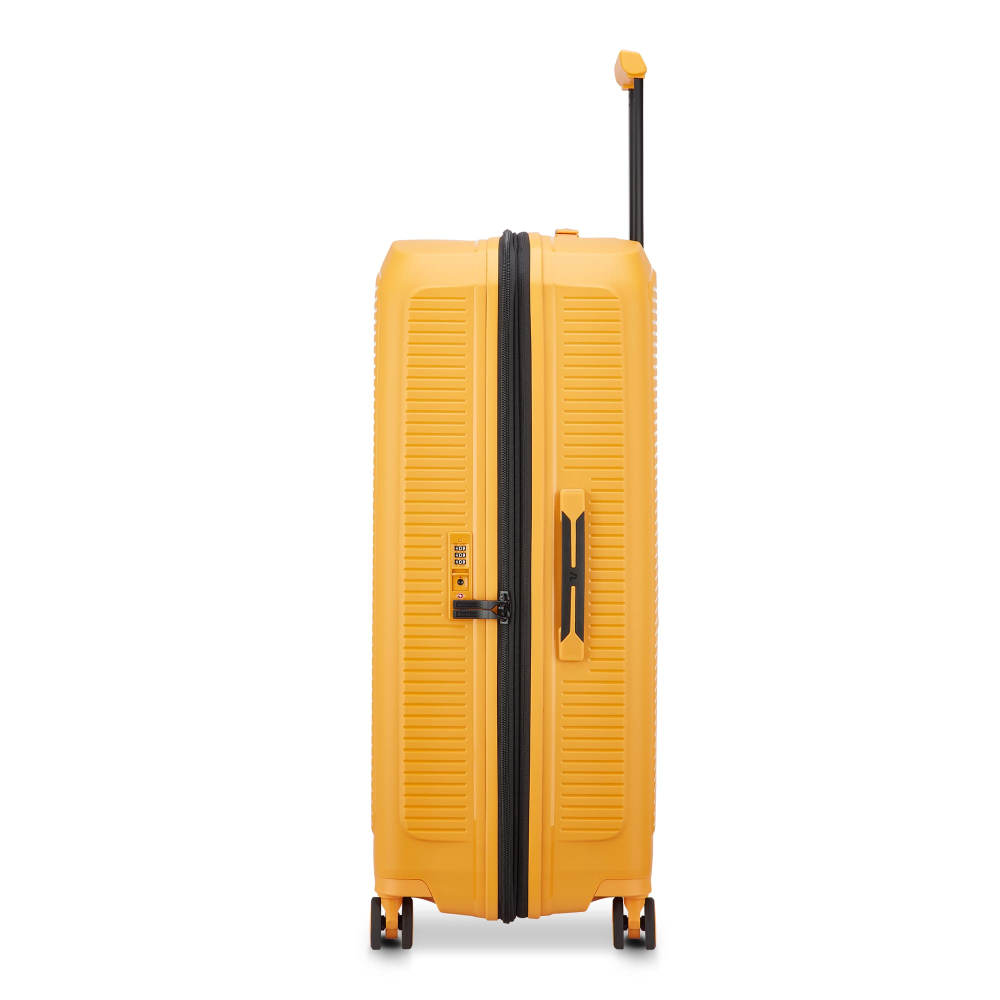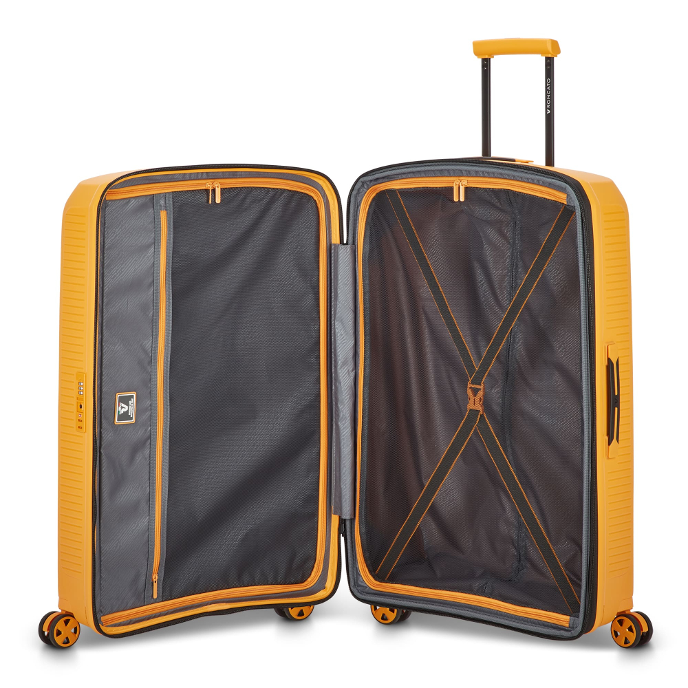 Чемодан изготовлен из полипропилена на 100% переработанного материала, который предлагает: максимальную ударопрочность, чрезвычайную прочность, оптимальную лёгкость, термостойкость. Оснащена 4 спаренными и маневренными колесами. Для удобства перемещения предусмотрена гибкая, подъемная пластиковая ручка на верхней и боковой панелях, а также телескопическая ручка. Безопасность и сохранность багажа обеспечивает встроенный кодовый замок с системой TSA. Изделие состоит из двух больших отделений, оснащенных разделителями и эластичными прижимными ремнями. Также имеет расширение для увеличения пространства для вещей.
