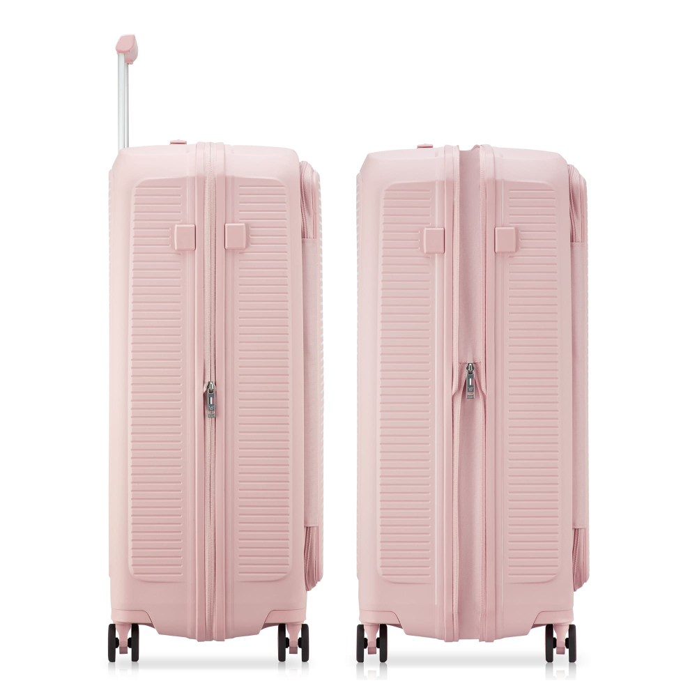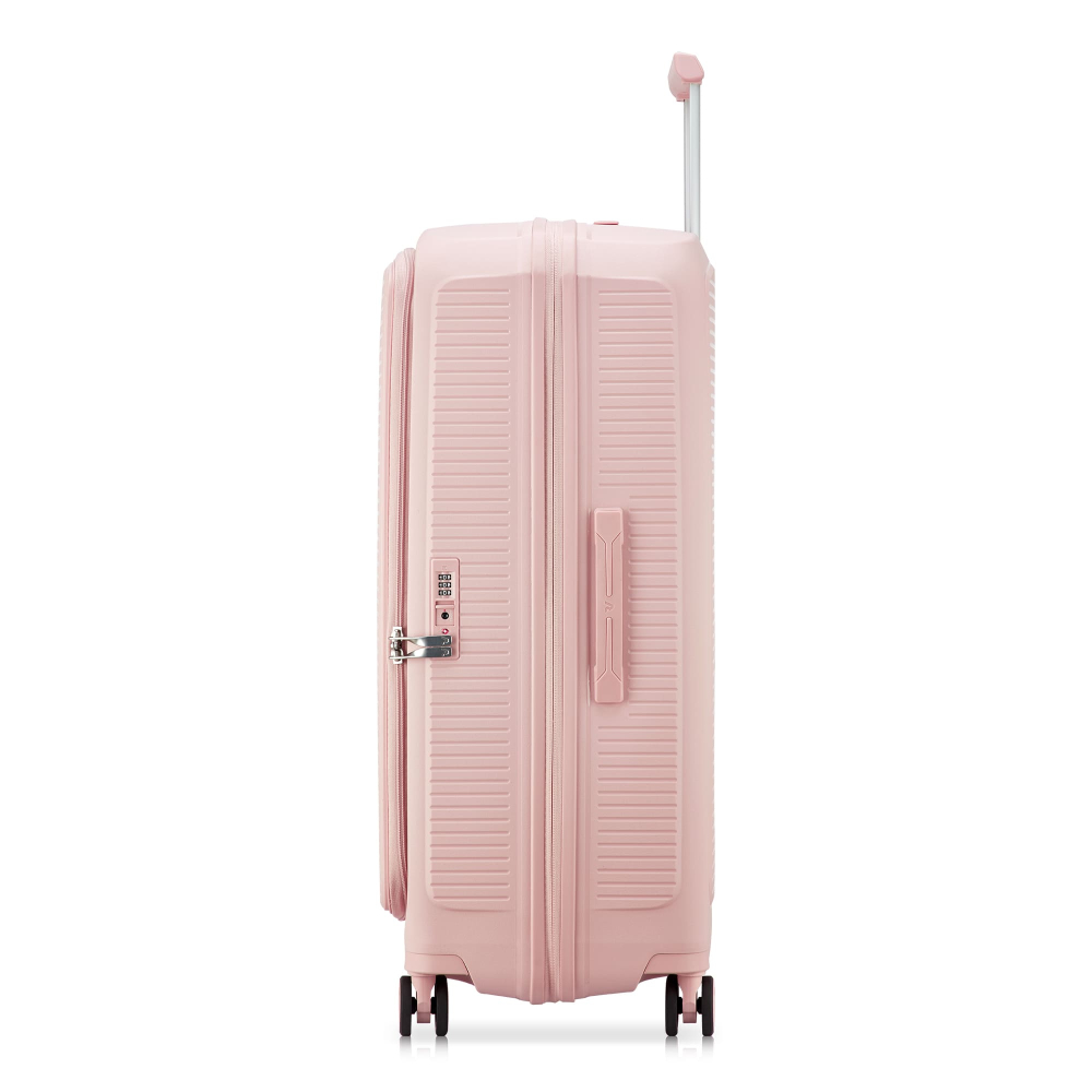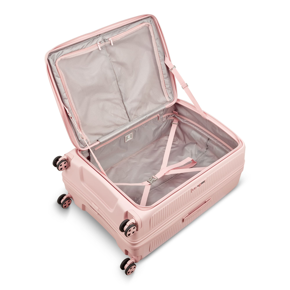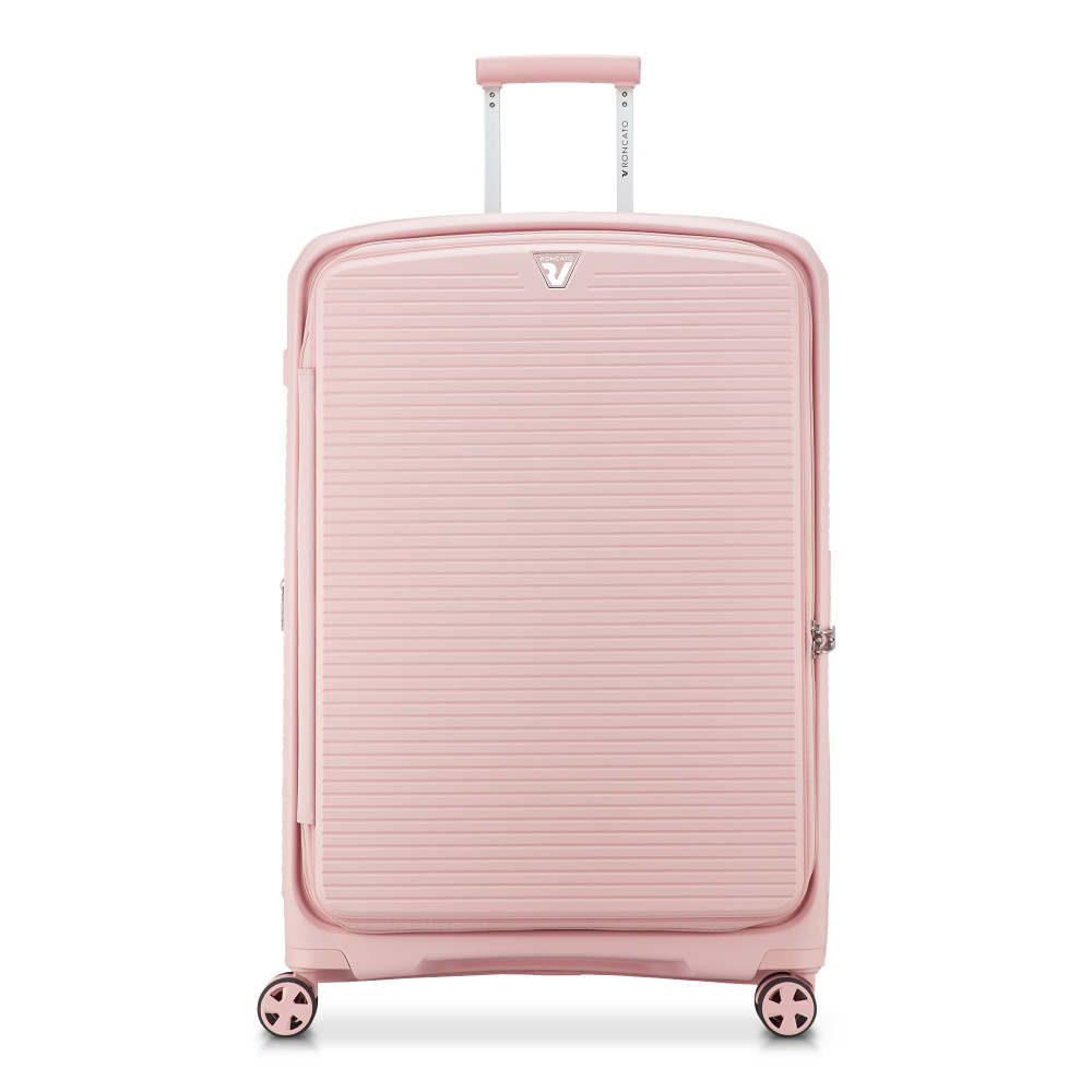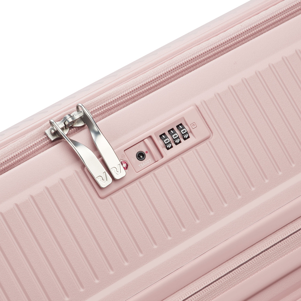 Валіза виготовлена з поліпропілену на 100% переробленого матеріалу, який пропонує: максимальну ударостійкість, надзвичайну міцність, оптимальну легкість, термостійкість. Оснащена 4 спареними і маневреними колесами. Для зручності переміщення передбачена еластична, підйомна пластикова ручка на верхній та бічній панелях, а також телескопічна ручка. Безпека і збереження багажу забезпечує вбудований кодовий замок з системою TSA. Серед найцінніших особливостей – інноваційна система FLAT TOP: кришка, що відкривається на 90° замість центрального отвору. Дизайн розроблений для зменшення об'єму та полегшення доступу до вмісту.