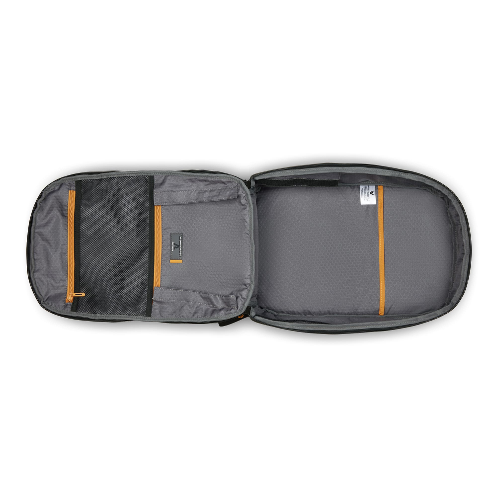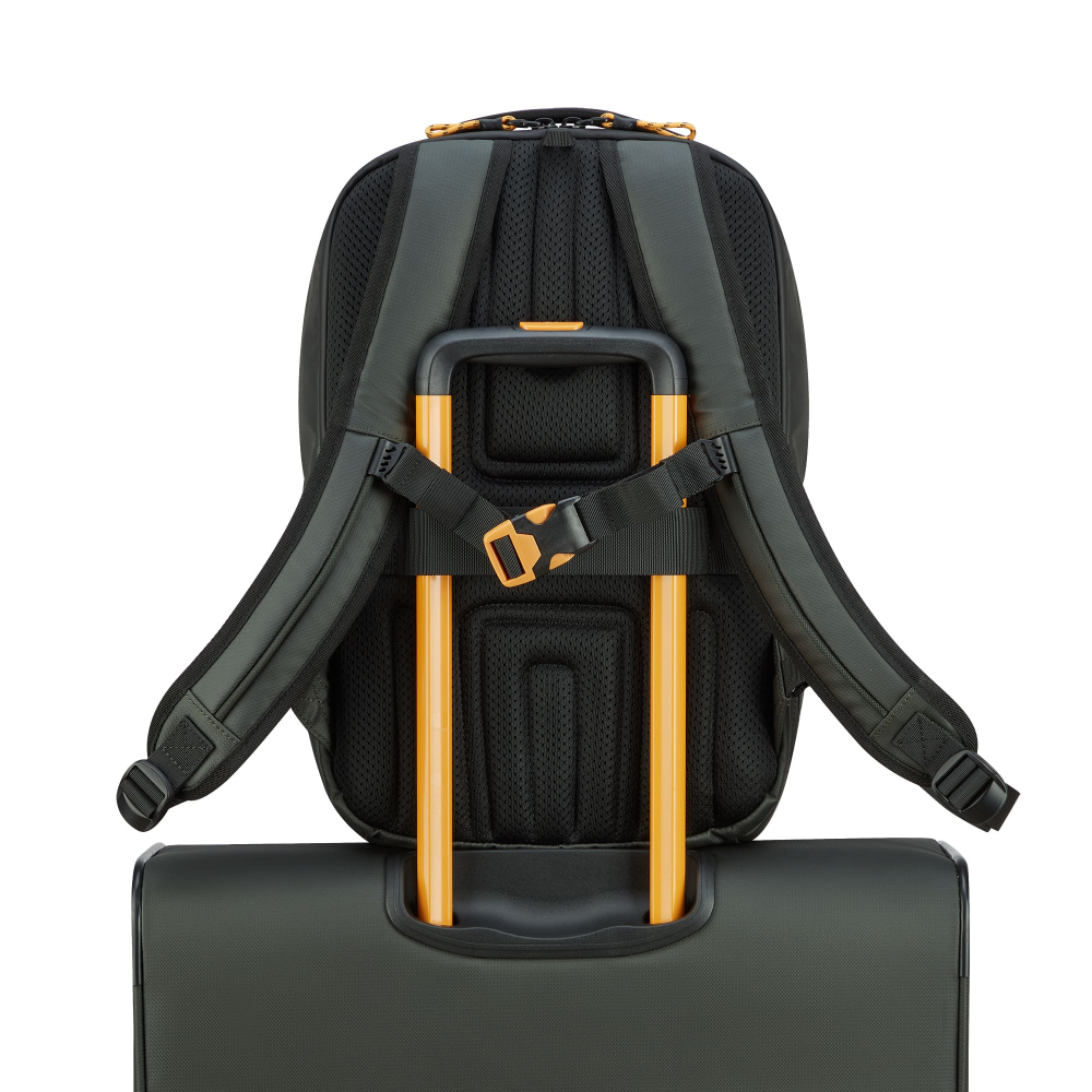 Рюкзак для подорожей-унікальна можливість поєднати особисті речі з сучасними гаджетами. Ідеальний варіант для відряджень в яких Вам знадобляться техніка, предмети першої необхідності і місце для одягу. Вироби колекції виготовлені з хвилястого поліестеру 900D з PU-покиттям, яке захищає від дощу, бризок, вологи й швидко сохне. Виріб оснащений двома основними віддідами, з кишенею для дрібних предметів з сітчастою перегородкою для організації та розділення одягу. Другий відділ призначений для ноутбука 15.6", планшету та документів формату А4. Також, передбачена бічна кишеня для пляшки/парасольки. Для зручності переміщення на задній частині розміщені м'які плечові ремені, планка для фіксації на телескопічній системі валізи, можливість застібнути плечові ремені фіксатором на грудях та ручка для вертикального перенесення.