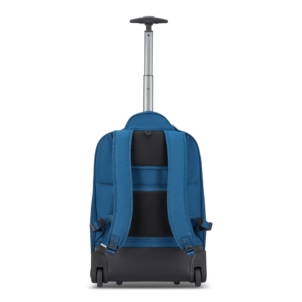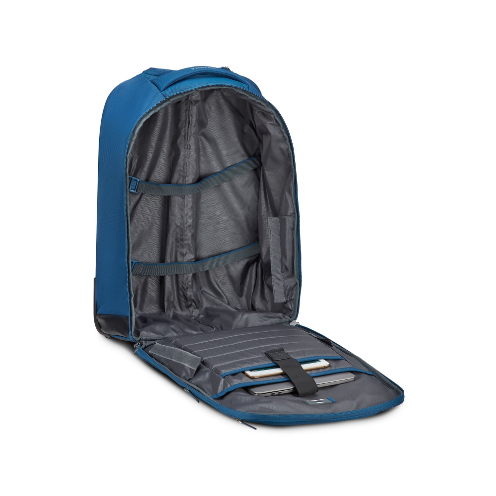 Вироби колекції виготовлені з міцної поліефірної жаккардової тканини 800Dx400D. Рюкзак на колесах-унікальна можливість поєднати особисті речі з сучасними гаджети. Ідеальна варіант для відряджень в яких Вам знадобляться, на борт літака, ноутбук до 17" і планшет до 10" і місце для речей. Оснащений містким основним відділенням і зовнішніми кишенями. Для зручності переміщення на задній частині розміщені м'які плечові ремені з ортопедичною спинкою.