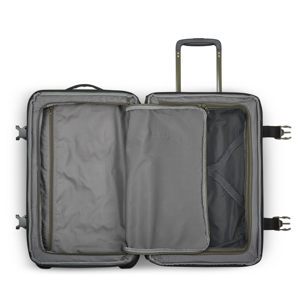 Вироби колекції виготовлені з хвилястого поліестеру 900D з PU-покиттям, яке захищає від дощу, бризок, вологи й швидко сохне. Оброблена поверхня гарантує високу стійкість до стирання та зносу, а також чудову стійкість до зчеплення та розривів, навіть за умов інтенсивного використання. Кожна сумка оснащена водонепроникною блискавкою та кодовим замком TSA-системою що забезпечує максимальну безпеку ваших особистих речей. Практичні відділення з перегородками на блискавці, еластичні ремені для одягу та велика кишеня для розділення брудного одягу. Наявна нижня ручка для полегшення підйому багажу, колеса для зручності переміщення та ніжки для стійкості.
